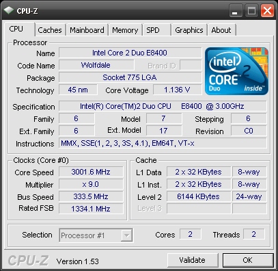 CPU-Z is a freeware utility that gathers information on some of the main devices of your system. CPU-Z doesn't require any installation(it does provide the possibility though), all you need to do is run it. It doesn't use any additional files, nor does it write to the registry. CPU information like: name and number, core stepping and process, package and much more. Mainboard information like: vendor, model and revision, BIOS model and date, chipset and sensor and graphic interface. Memory information like: frequency, timings and module(s) specification(like vendor and default timings) using SPD. It will also show you systems Windows and DirectX version.